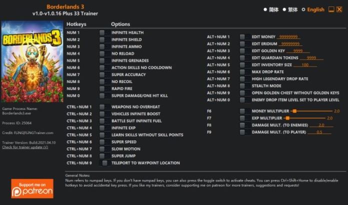 | Alt+Num 3 | Edit Golden Key | Редактировать золотые ключи, после активации откройте инвентарь, чтобы увидеть изменение значений. Вам нужно получить хотя бы один золотой ключ, чтобы он заработал. Чтобы получить золотые ключи в начале игры, используйте shift code (введите его в меню Главное / Пауза-Социальные-Shift) ZFKJ3-TT3BB-JTBJT-T3JJT-JWX9H, чтобы получить 3 золотых ключа. |