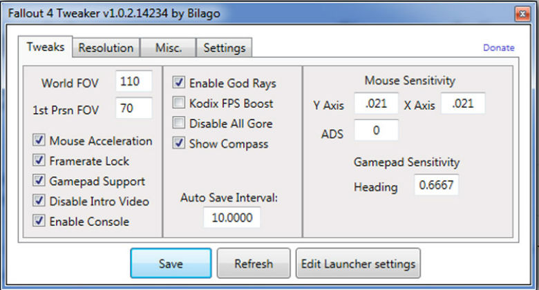 Также утилита может менять ускорение и чувствительность мыши, включать блокировку частоты кадров. Можно отключить заставку, кровь в игре. Присутствует вкладка для настройки цветов Pip-Boy и системы VATS (можно также сделать в настройках Fallout 4). Утилитой также настраивается игровое разрешение.