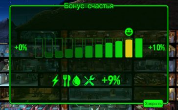 Уровень счастья убежища – индикатор, который показывает счастье жителей. На него влияет удовлетворение всех обитателей. Его можно увеличить, определив жителей в правильные комнаты или успешно использовав «Ускорение». После щелчка по индикатору Вы можете проверить бонус счастья — чем выше счастье, тем значительнее будет бонус.