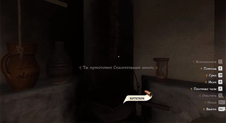 - Возьмите одну из фляг рядом с котлом (под духами). Вылейте смесь из котла в флягу. Всё, теперь у вас есть Спасительный шнапс.