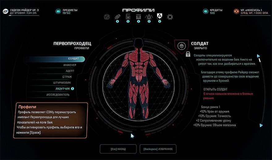Исследователь: это профиль на все руки мастер, который используют боевые, технические и биотические умения. Вы получите различные бонусы с этим профилем по мере повышения уровня, соответствующего всем деревьям навыков. Он будет разблокирован после того, как вы вложите по 2 очка в Бой, Технику и Биотику.