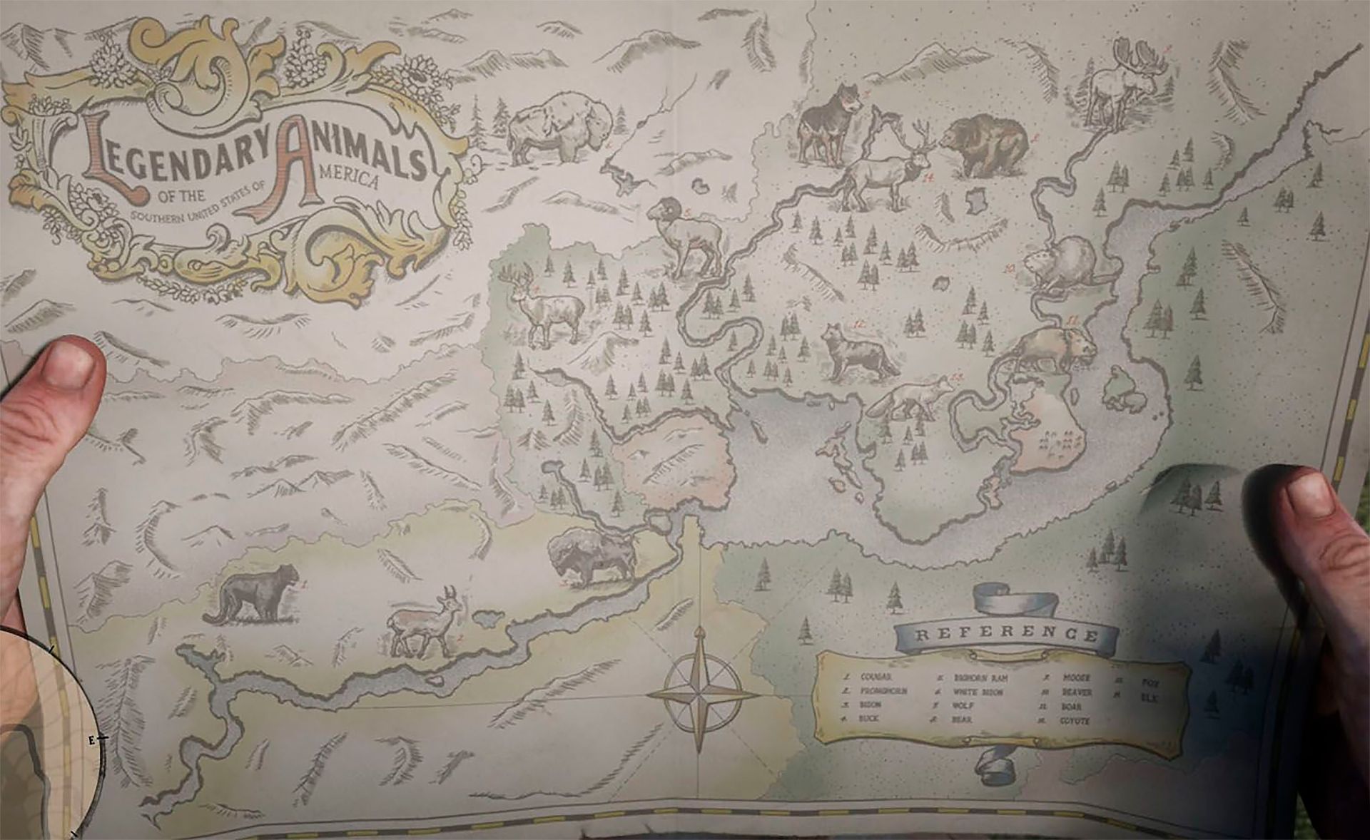 В первый раз, когда отправитесь на охоту с Хозией в Главе 2, вы пойдёте на поиски легендарного медведя гризли. Во время этого квеста Хозия даёт вам карту, детально описывающую местонахождение всех легендарных животных на юге Соединённых Штатов Америки (доступ к карте через сумку в любое время). На карте показано расположение 14 легендарных животных, но есть ещё 2 не обозначенных, но тоже легендарных зверя: