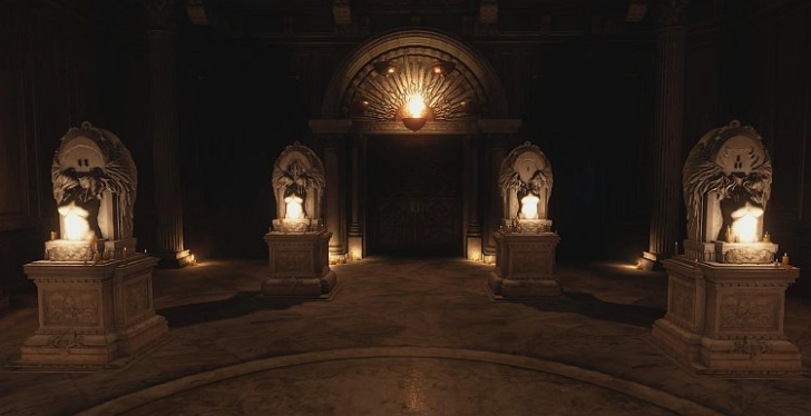 Теперь всё, что осталось сделать, чтобы сбежать из Замка Димитреску, — это поместить Маски Ангела на сами статуи в Зале Четырёх. В порядке слева направо правильная последовательность: