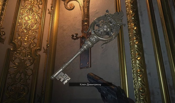 Когда решите головоломку, спускайтесь по недавно обнаруженной лестнице. Затопленный склад и там вас встретят несколько врагов, так что снимайте их и двигайтесь вперёд, пока не найдёте лифт. Поднимитесь на нём, и вы окажетесь на балконе снаружи. Следуйте по пути, и начнётся кат-сцена с участием леди Димитреску. Войдите в комнату, в которой она только что была, и Ключ Димитреску будет висеть на крючке на стене. Просто приготовьтесь к тому, что будет дальше.
