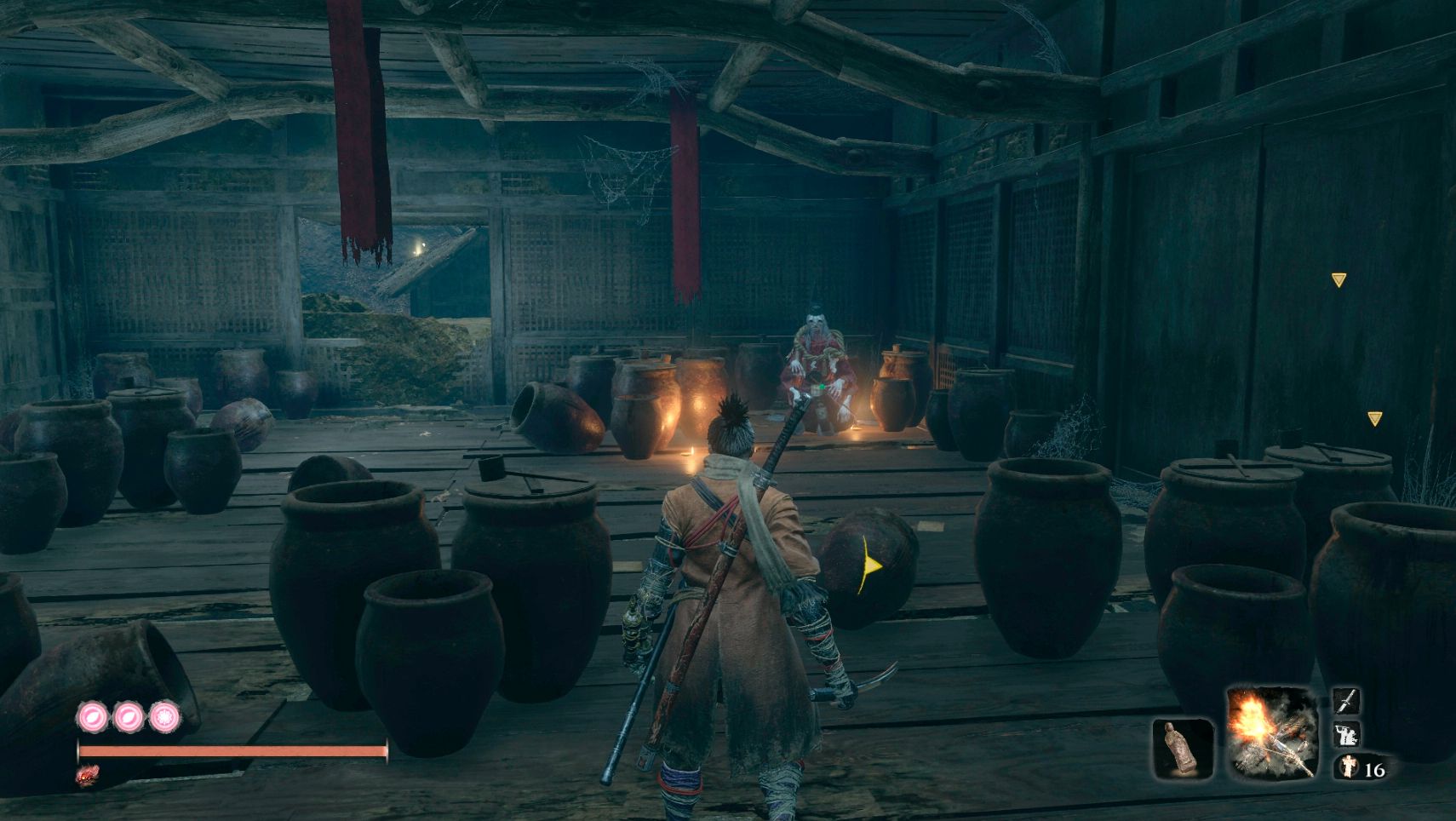 Присядьте и зайдите под здание. Найдите там вращающуюся дверь и взаимодействуйте с ней, чтобы войти в внутрь. Там в углу вы увидите пьющего старика. Поговорите с ним несколько раз, пока не появится выбор предложить ему Воду Дворца. Взамен он даст вам сакэ «Драконий источник». Вернитесь к идолу, отдохните, затем вернитесь, чтобы увидеть этого человека. Он нападёт на вас. Победите его, чтобы получить 5 драгоценных чешуек карпа.