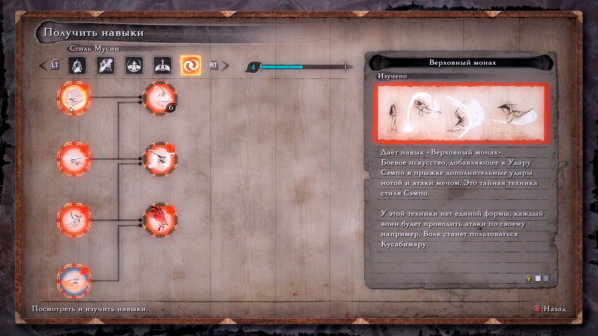 Важно! Чтобы Эмма передала вам тайное учение Мусин, у вас должны быть изучены все навыки стилей в дереве.
