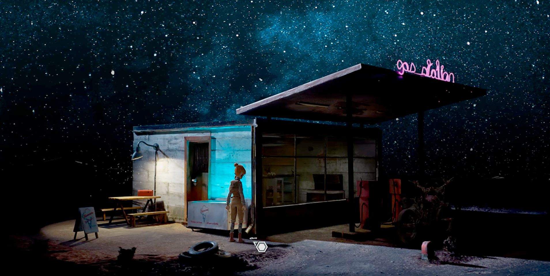 Игра начинается на заправке, где главный герой прибывает на своём мотоцикле. Его необходимо заправить и охладить двигатель. Если попытаться заправиться, девушка скажет, что колонка не работает. Подойдите к входной двери и посмотрите на ящик для инструментов слева от двери. Внутри плоскогубцы. Возьмите их, взаимодействуйте с трубой справа от двери, чтобы выпал ключ. Поднимите его и откройте им дверь.